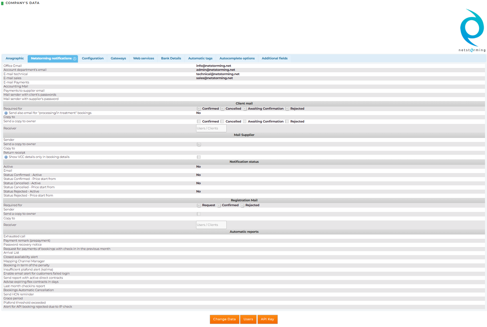 Bookings Automatic Cancellation: configuration of email addresses for sending an automatic email generated by enabling booking auto-cancellation. Activated from Admin > Clients > Clients > search for the Client. “Edit Data” in the Configuration tab > select Automatic bookings cancellation