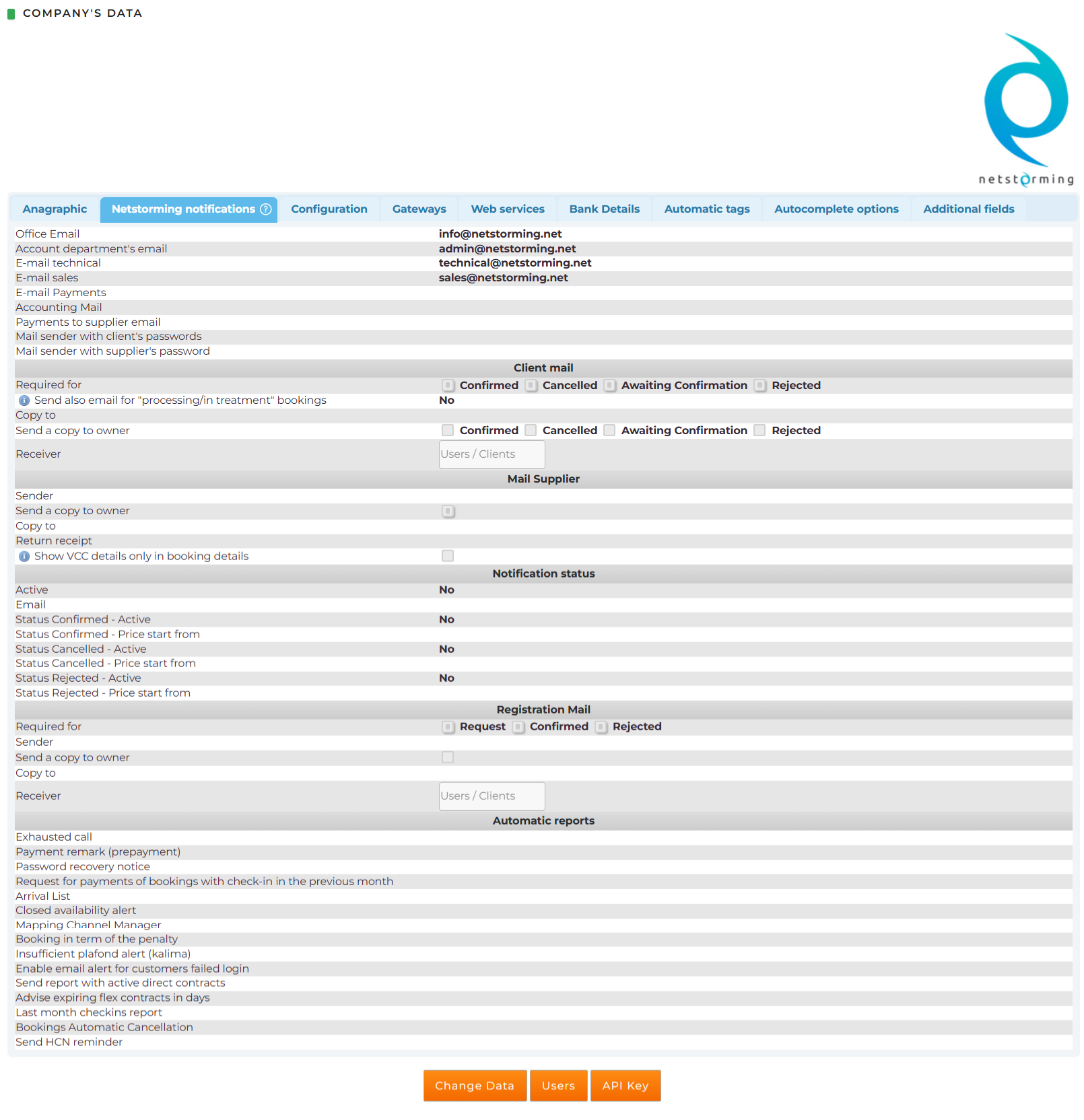 - Account department email: address from/to which e-mails are sent with prepayment records, due payments, and check deposit accounts, as well as in hidden copy for automatic sending of the arrivals list. It is therefore used for all notifications regarding accounting aspects of the system