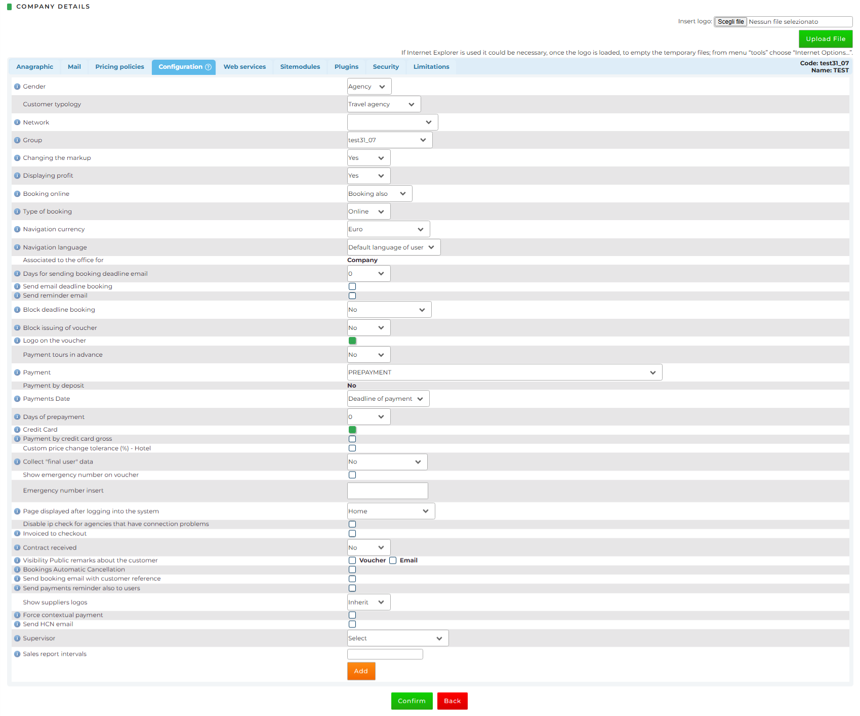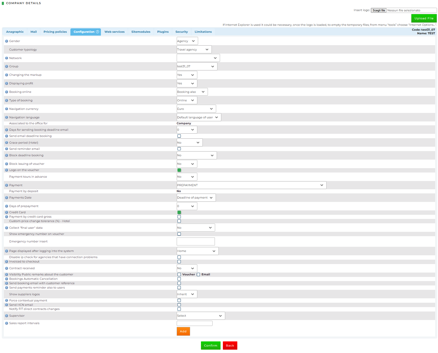 - Credit Card: allows the Tour Operator to decide if the Client can also pay the reservations (web only) by credit card. If the payment is made by credit card, the confirmation will be sent only to the email address of the user who made the payment