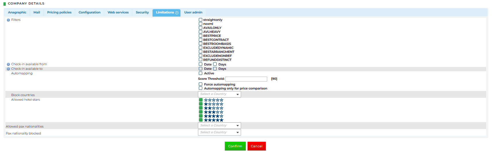 - Block countries: it refers to the destination. Example: by setting the block country for France, any hotel located in France will not appear