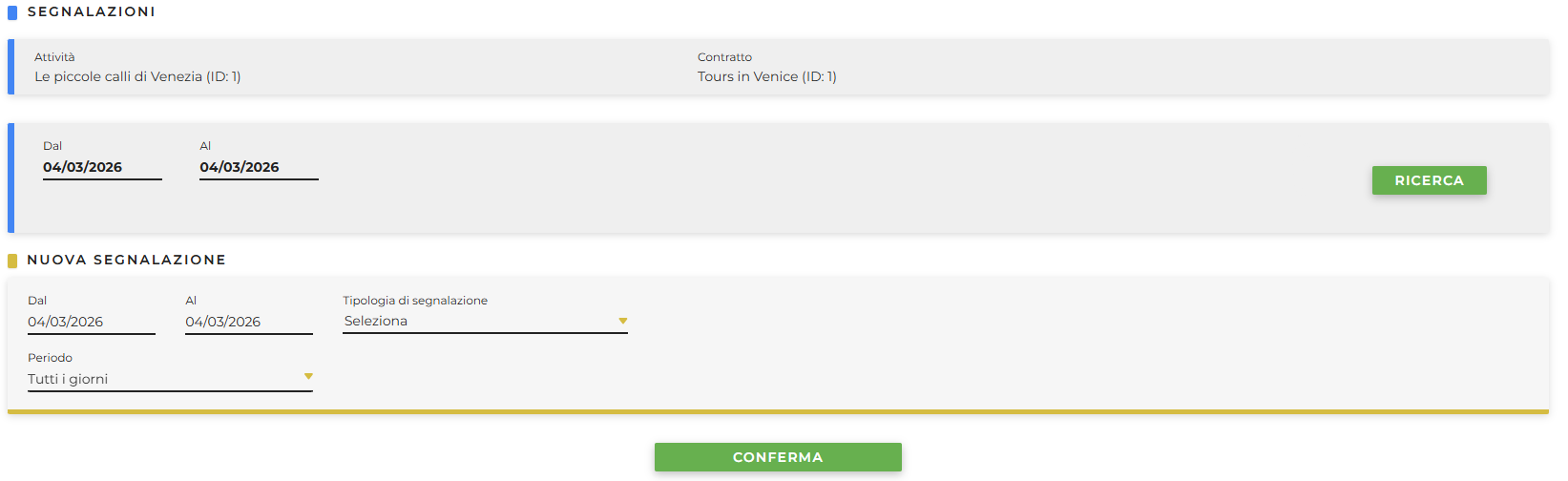 - Periodo: è possibile decidere in quali giorni far visualizzare la segnalazione