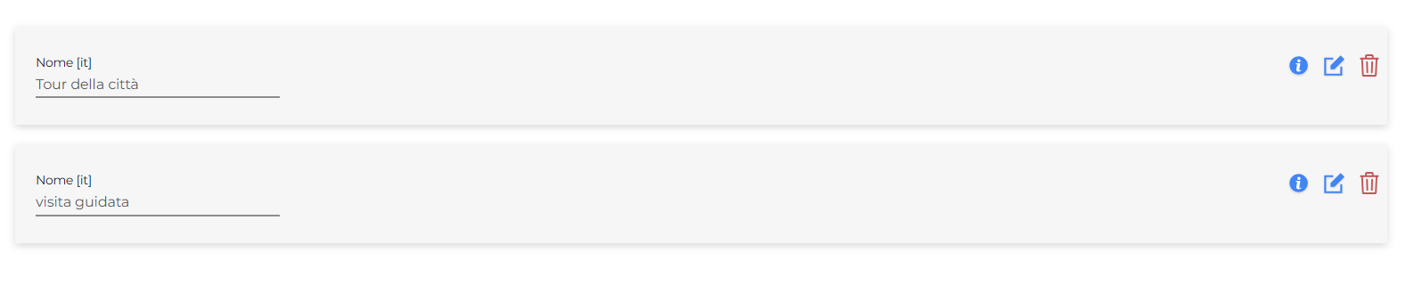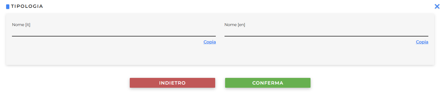 La definizione di una Tipologia e la relativa associazione ad una Attività, è facoltativa ed ha lo scopo di filtraggio delle Attività, sia nella schermata di ricerca delle attività, sia dopo una ricerca di disponibilità.