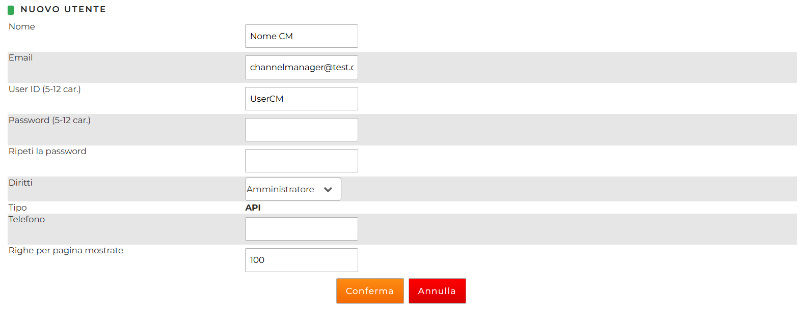 - creare direttamente un Utente API ed inviare la password al Channel Manager scegliendo un canale sicuro esterno alla piattaforma