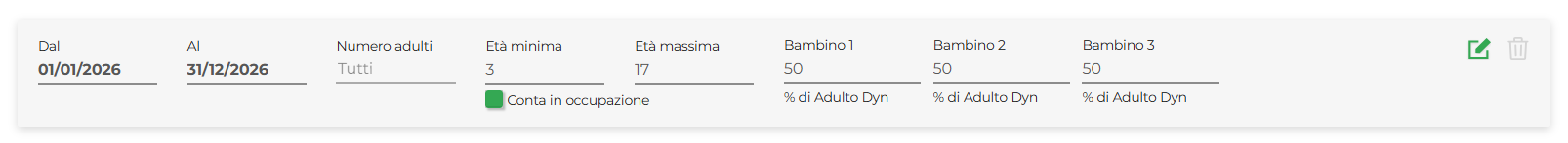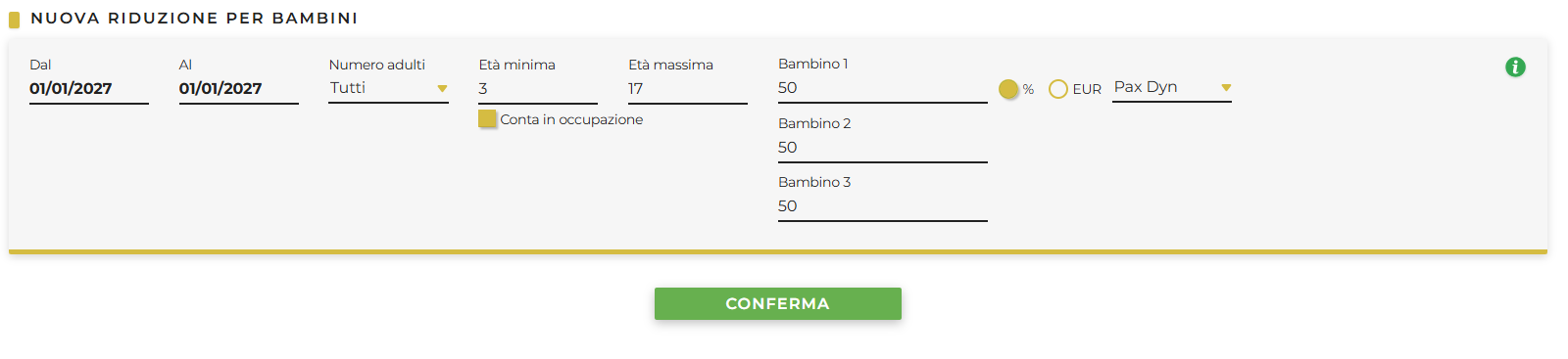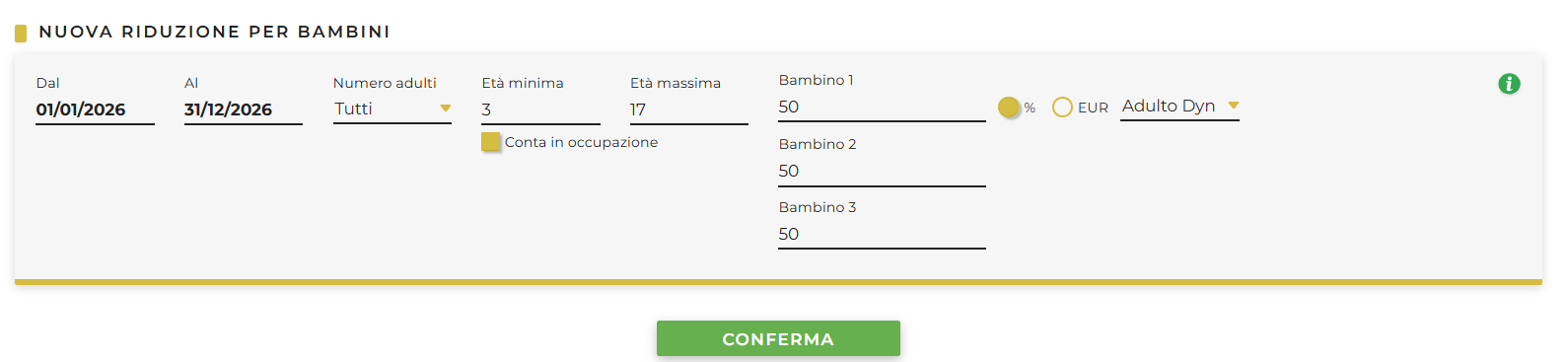 In questa sezione si possono impostare le riduzioni in percentuale o gli importi fissi dedicati ai bambini di default da 3 anni in su, con la possibilità di definirne l'età massima. Si rammenda che per personalizzare anche l'età minima è necessario selezionare Conta infanti come bambini nelle Opzioni Avanzate di un Nuovo Contratto (al momento possibile solo per il flusso XML, no per interfaccia web).