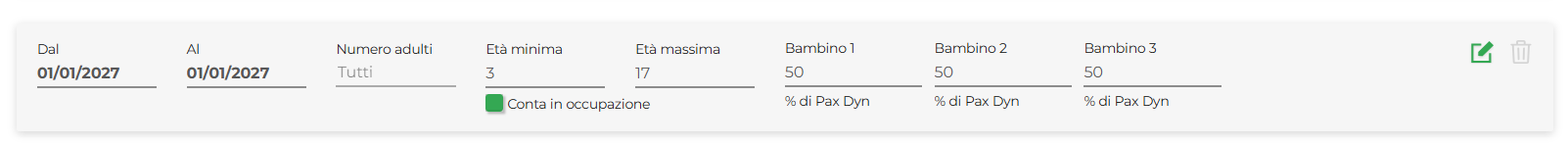 Pax dyn: consigliato per il calcolo del prezzo del bambino quando equiparato al prezzo dell’adulto; rappresenta una riduzione calcolata sul numero delle persone totali. Esempio: