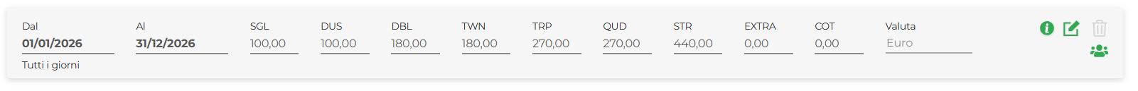 Valuta: se si necessita di inserire un importo definito per l'intero periodo contrattuale. NB: in questo caso l'importo inserito sarà quello finale (non viene sottratto). Nei casi di più importi in relazione a diversi periodi, è necessario gestirli nella sezione Extra in Tariffe
