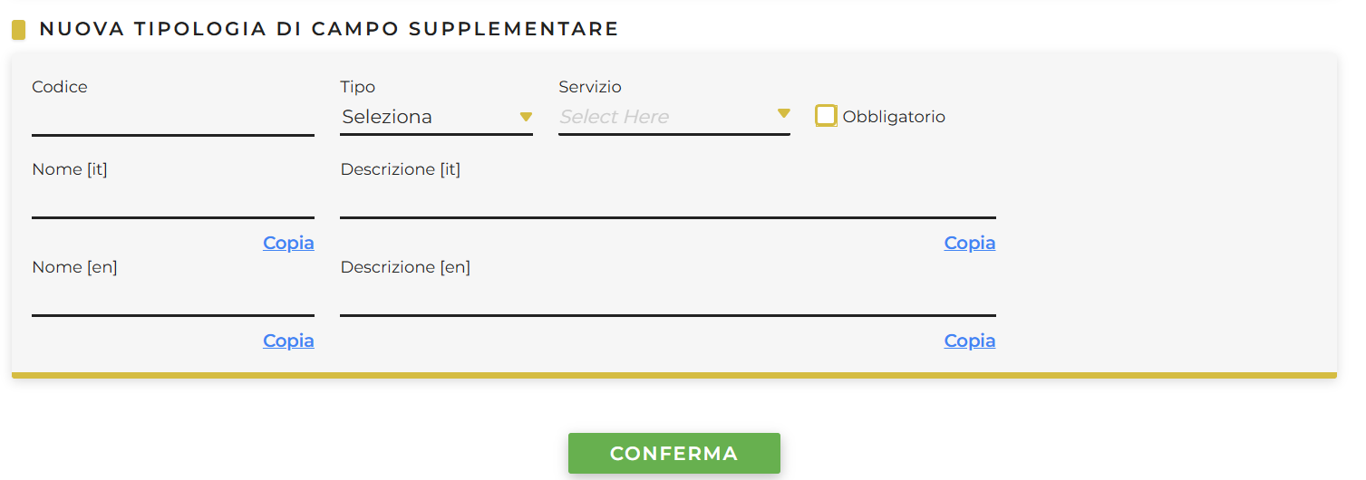 Il sistema può avere delle tipologie di campi supplementari precaricate, con la possibilità di inserirne di nuove: