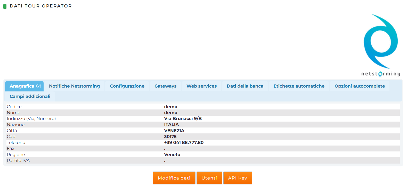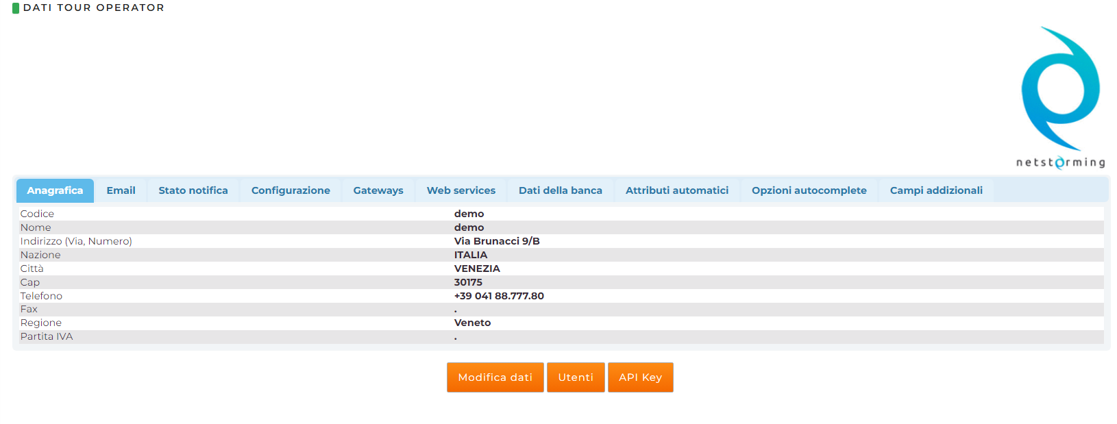 - Codice: sarà il codice usato come primo dato d'accesso (prima di user e password). Sarà stabilito da Netstorming e non sarà modificabile