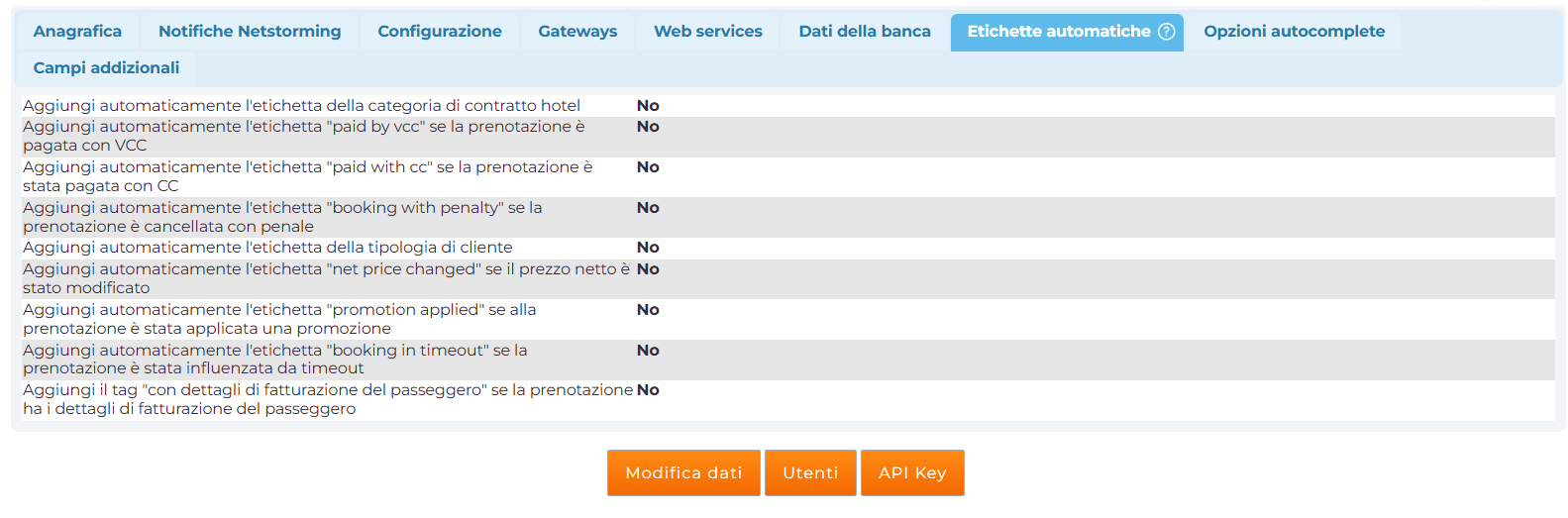 Da questa sezione è possibile impostare l'aggiunta di etichette automatiche all'interno delle prenotazioni, per faciltare il raggruppamento per la ricerca delle stesse.