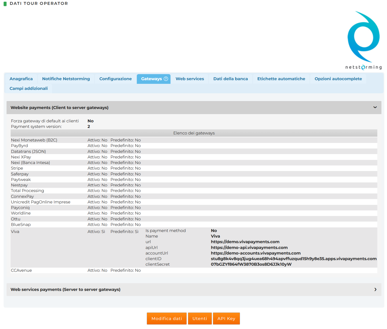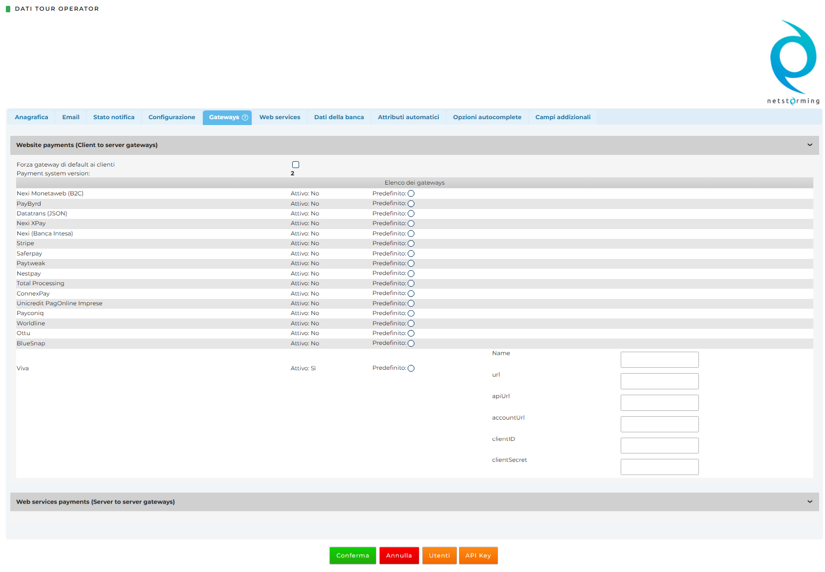 Sarà configurata da Netstorming in seguito al ricevimento delle credenziale da parte del tour operator.