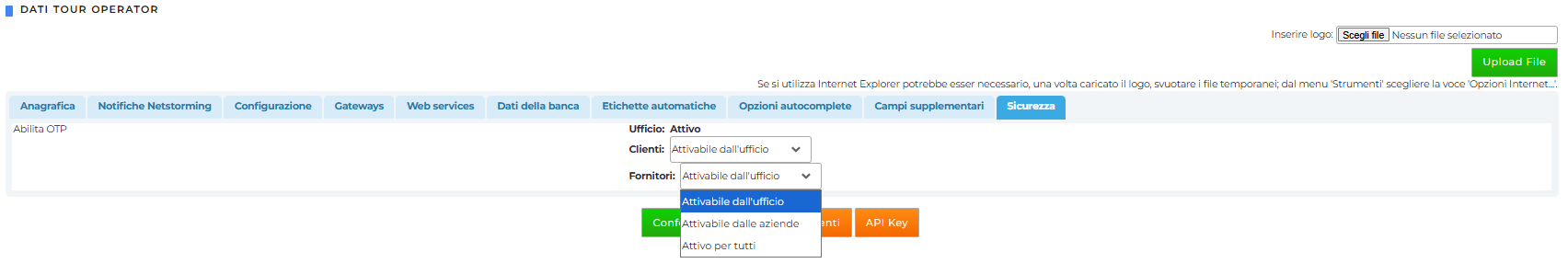 Clienti: tale scelta influenzerà il campo abilita otp nel tab Sicurezza della scheda Cliente; si avranno disponibili tre opzioni Attivabile dall'ufficio (il Tour Operator ha la possibilità di abilitare/disabilitare l'otp), Attivabile dalle aziende (il Cliente ha la possibilità di abilitare/disabilitare l'otp), Attivo per tutti (sia il Tour Operator sia il Cliente hanno la possibilità di abilitare/disabilitare l'otp)
