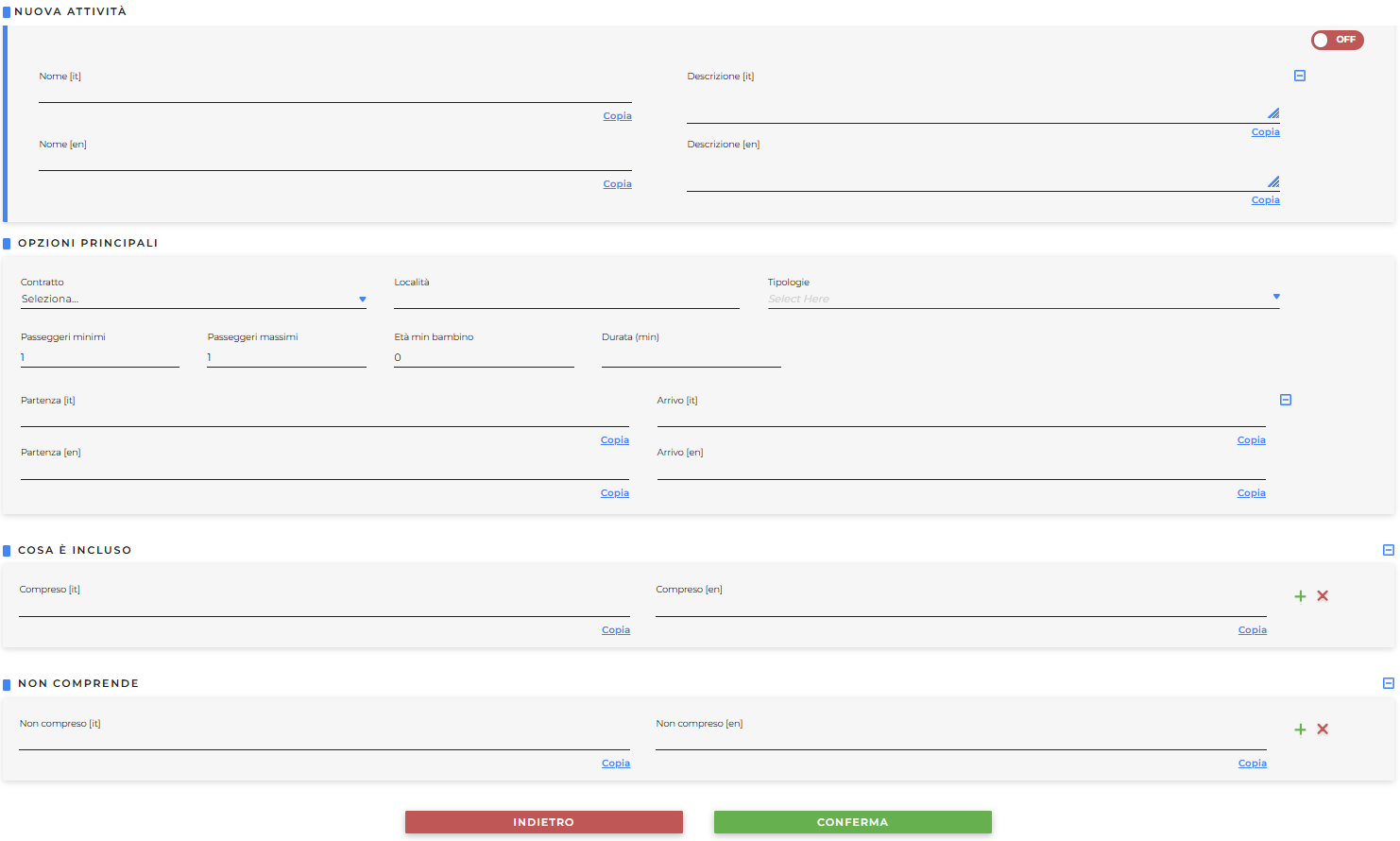 - Nome: campo obbligatorio, definire il nome che si vuole dare all’attività in tutte le lingue possibili dal sistema. Dopo aver definito il nome per una lingua è possibile popolare tutti gli altri campi con lo stesso nome cliccando su copia