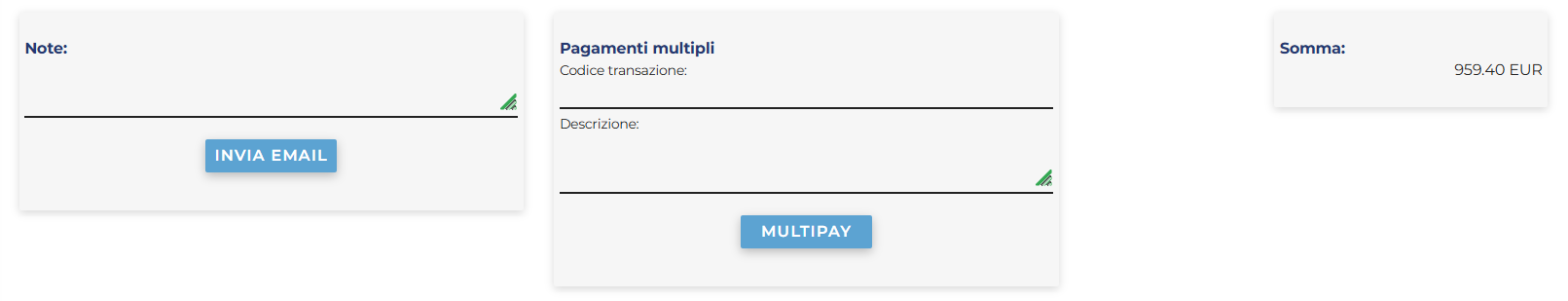 Sezione necessaria nel caso di Clienti a deposito e linea di credito (plafond). In questa sezione è possibile consultare il resoconto dei pagamenti dei clienti del Tour Operator e contrassegnare anche in modo massivo (Pagamenti multipli) se è stato ricevuto il pagamento (ad esempio indicare "bonifico bancario" in Descrizione). Mediante il tasto pay si procede alla conferma di pagamento. È inoltre possibile indicare un pagamento parziale (in Da Pagare) e spedire eventuali note via mail.