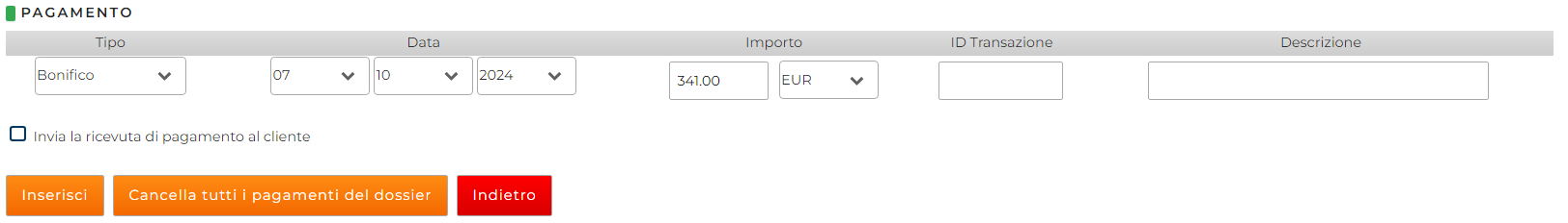 sarà quindi possibile registrare il pagamento una volta avvenuto. Cliccando sul tasto "Paga" apparirà la pagina dedicata all'inserimento dei dati relativi al pagamento: