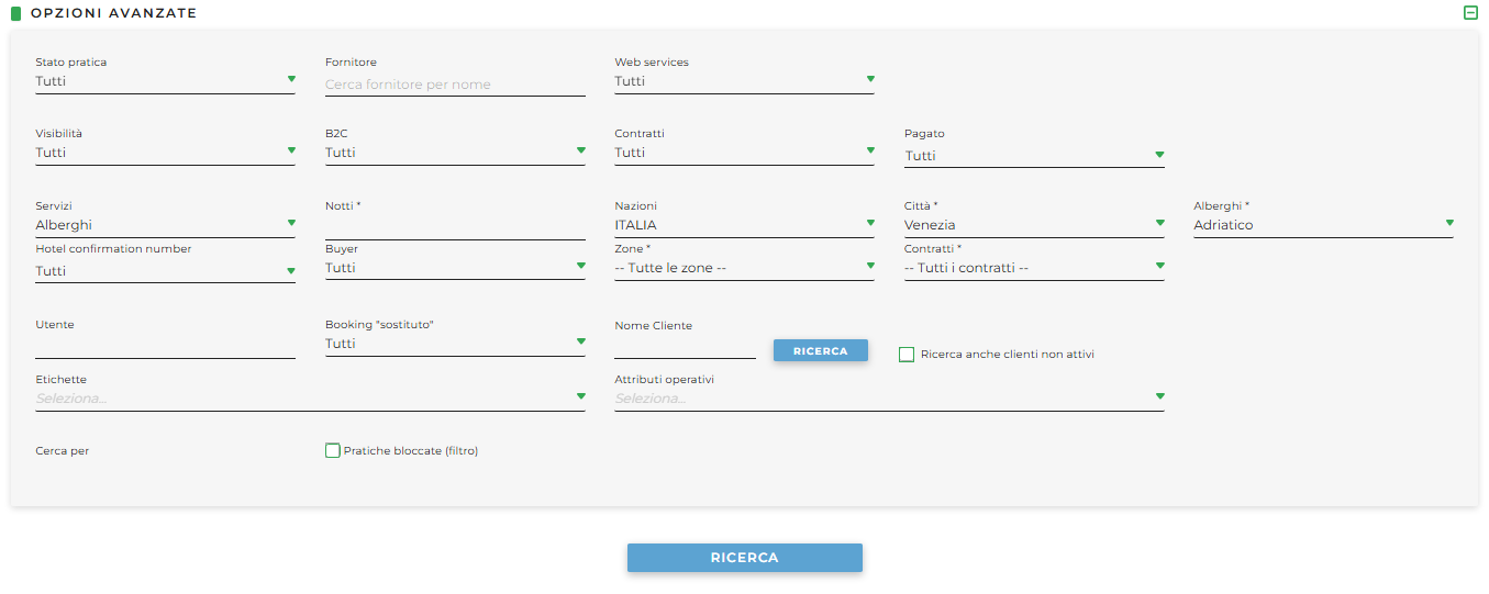 Si prega di considerare che per ricercare una prenotazione riguardo ad un contratto specifico, è necessario impostare nelle Opzioni Avanzate, nel campo Servizi, la voce Alberghi e procedere alla compilazione delle informazioni geografiche quindi scegliere l'hotel dal menu a tendina e il relativo id del contratto: