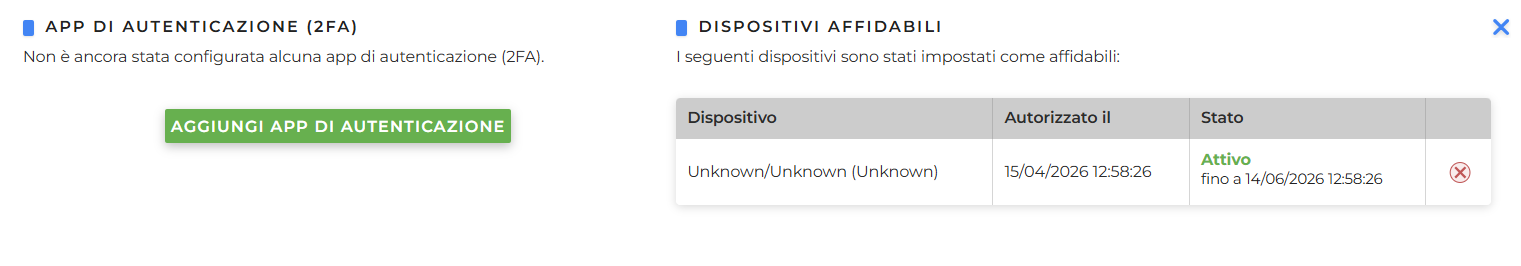 saranno inoltre elencati i dispositivi marcati come affidabili per cui è possibile la rimozione manuale tramite pulsante X. Si prega di considerare che, per motivi di sicurezza, il sistema tiene in memoria i dispositivi affidabili per due mesi, dopodichè è necessario ripetere l'operazione.