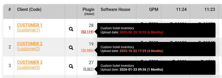 Nel caso del caricamento di un Custom Hotel Inventory il numero tra parentesi nella colonna "Plugin (Hotels)" sarà sottolineato e, al passaggio del mouse, apparirà un pop up informativo: