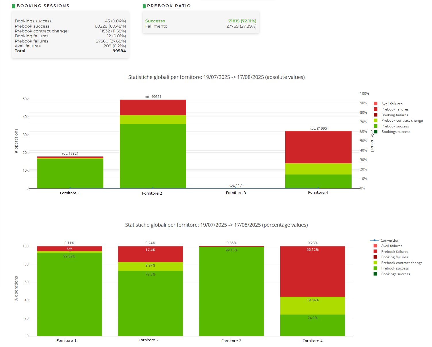 - Prebook failures: fallimenti in fase di verifica delle condizioni prima della prenotazione (prebook) riconducibili ad una cache troppo vecchia del Fornitore (ad esempio per cambio prezzi, disponibilità, ...)