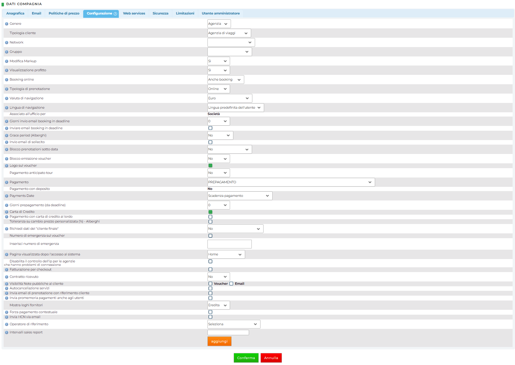 Pagamento: consente al Tour Operator di specificare il metodo di pagamento associato al Cliente, non sono personalizzabili. Ciò che viene scelto dal menu a tendina influisce la cancellazione automatica delle prenotazioni