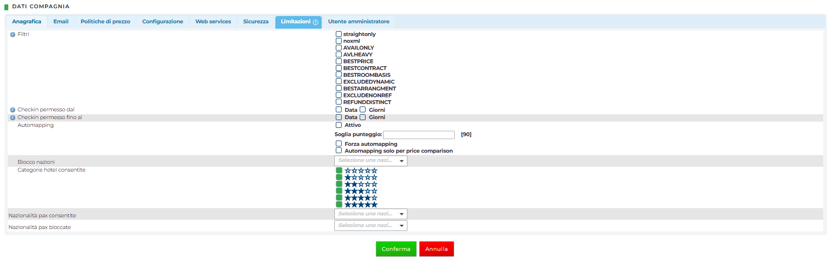 In questa sezione è possibile definire limitazioni che si applicano alle ricerche di disponibilità effettuate dal Cliente. Si rende noto che le modifiche che riguardano i filtri hanno effetto immediato.